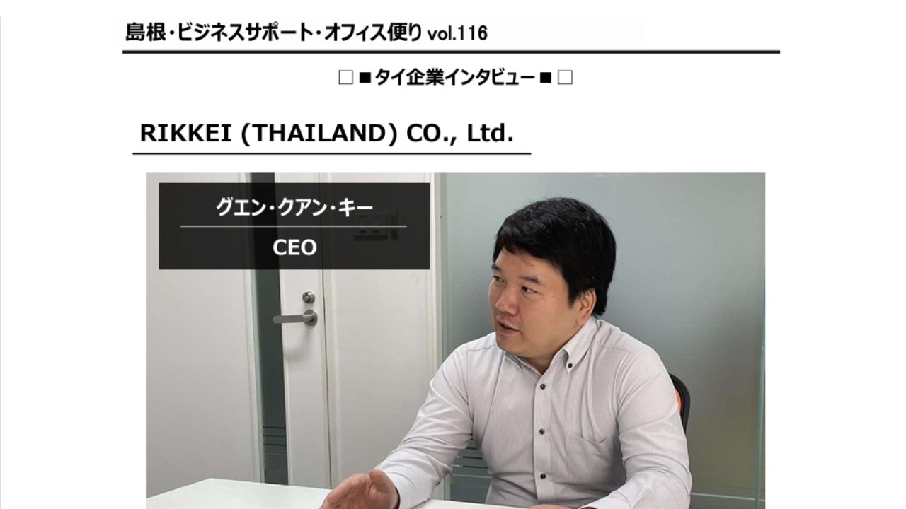 島根県(島根・ビジネスサポート・オフィス)が発行する、タイを中心とするアセアン諸国に関するビジネス情報や生活情報を提供するメディア『島根・ビジネスサポート・オフィス便り vol.116』と、アジア地域におけるビジネス支援サービスを提供するAsia Alliance Partner Co.,Ltd.のWebサイト『Japan Promotion』に当社子会社RIKKEI THAILANDのCEOであるNguyen Quang Kyのインタビュー記事が掲載されました。 インタビューでは、リッケイのタイでの事業展開の背景や強み、日本企業との関係、タイ市場における戦略、そして今後の展望について語られています。ぜひご覧ください。 ▼島根県『島根・ビジネスサポート・オフィス便り vol.116』(PDFファイル) https://www.pref.shimane.lg.jp/industry/enterprise/shien/kaigai/report.html ▼Asia Alliance Partner『Japan Promotion – タイ企業インタビュー|RIKKEI (THAILAND) CO., Ltd.』 https://aap-jpromo.com/%E3%82%BF%E3%82%A4%E4%BC%81%E6%A5%AD%E3%82%A4%E3%83%B3%E3%82%BF%E3%83%93%E3%83%A5%E3%83%BCrikkei-thailand-co-ltd/